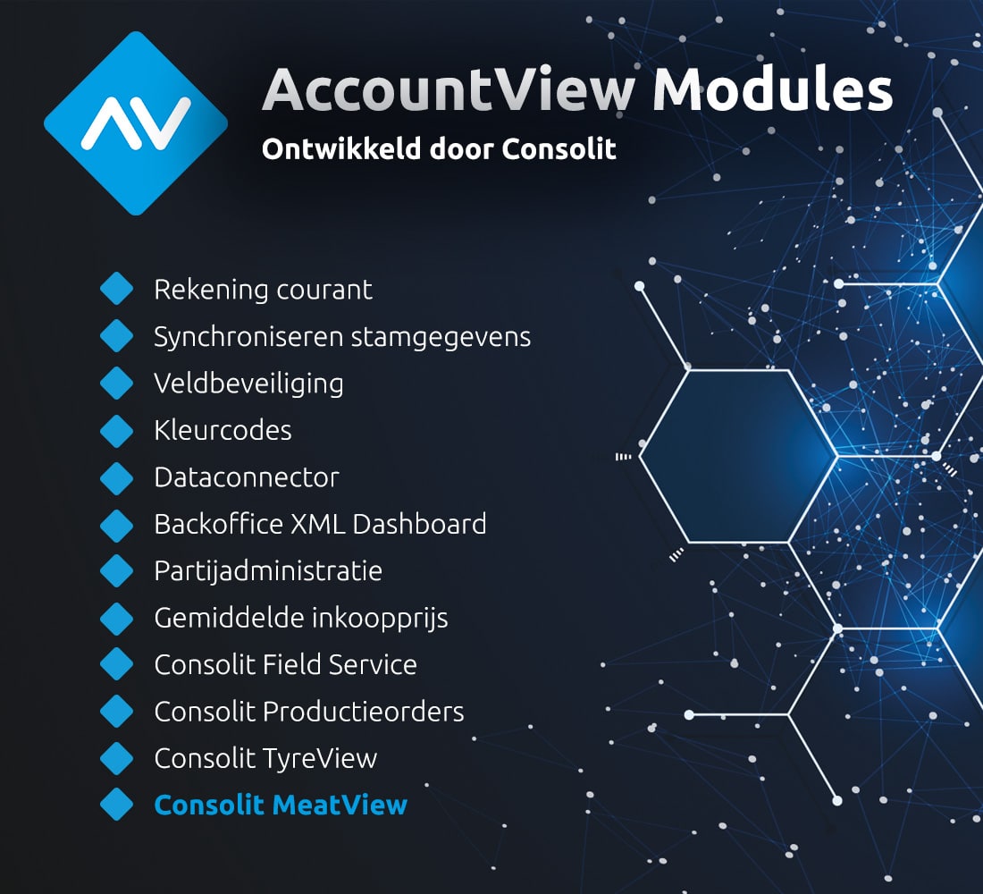 Consolit biedt een complete ERP-oplossing die al deze uitdagingen in je inkoop- en verkoopproces ondervangt. Onze software is speciaal ontwikkeld voor handels- en productiebedrijven in de vleesbranche en ondersteunt onder meer volledige traceerbaarheid, realtime inzicht in marges, geautomatiseerde planning en logistiek, slim voorraadbeheer, productie en portionering, inkoop- en verkoopcontracten, koppelingen met weegsystemen en EDI en volledige compliance. Onze module is ontwikkeld voor het softwarepakket AccountView, het sluit naadloos aan op je volledige financiële administratie.
