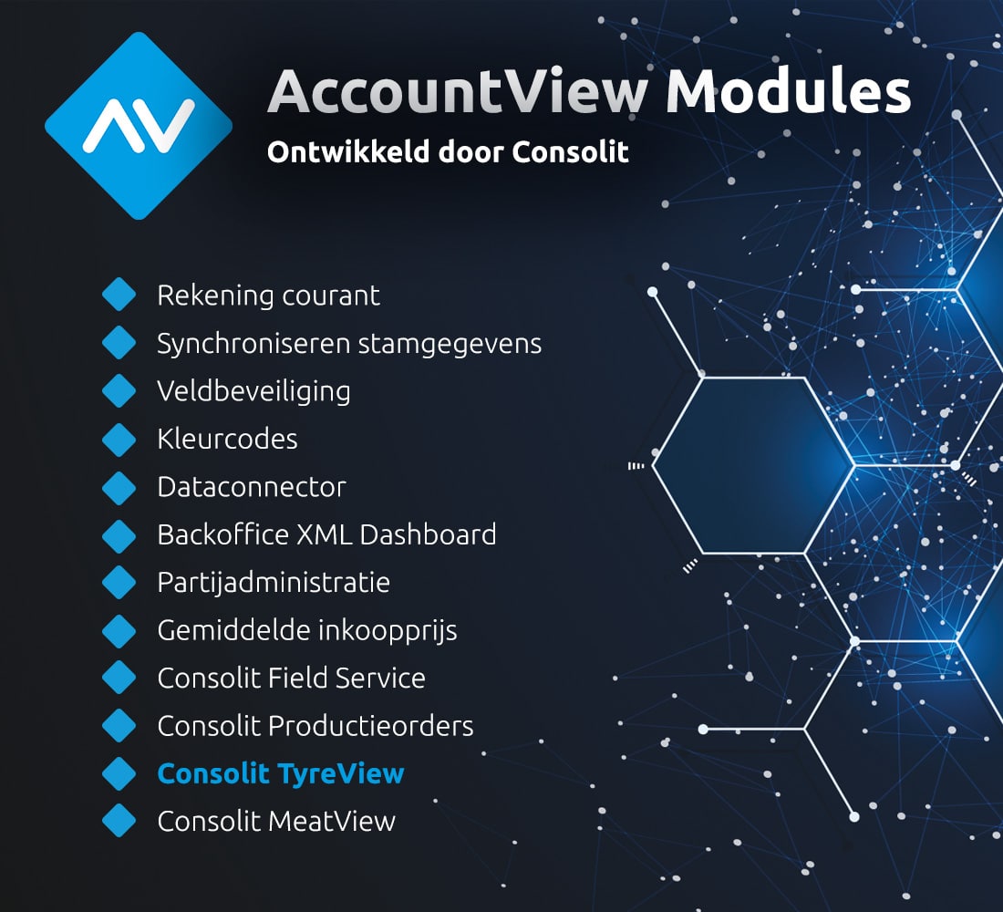 TyreView is de gespecialiseerde AccountView-oplossing voor de bandengroothandel. Met uitgebreide bandkenmerken, DOT-registratie, VACO-artikelkoppeling, BEM- en RecyTyre-afdrachten en realtime marge-inzicht ondersteunt TyreView het complete groothandelsproces in een markt met flinterdunne marges.